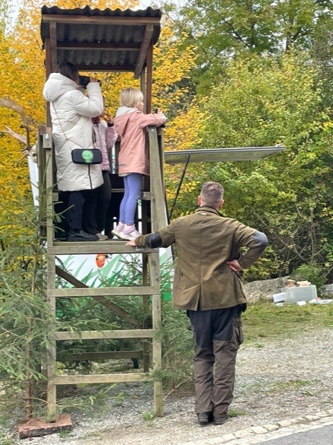 Vom Hochsitz aus suchten die Kinder, ausgestattet mit zwei Ferngläsern das dörfliche Umfeld nach versteckten Wildtieren, in diesem Fall natürlich Präparate, und entdeckten so den Fuchs am Hühnerstall, den Dachs im Obstgarten, den Marder auf dem Scheunendach und den Kletterkünstler Waschbär auf dem Flachdach des Gutshofes.